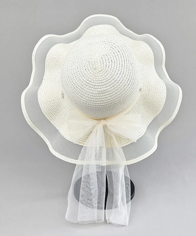 Chic White Tulle Patchwork Bow Straw Woven Floppy Sun Hat