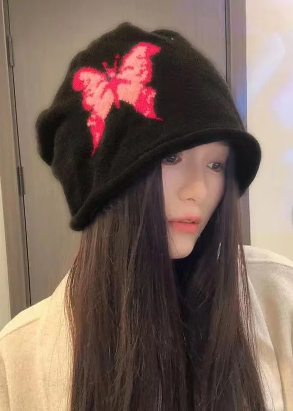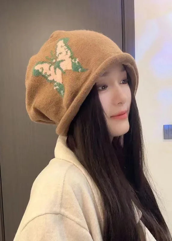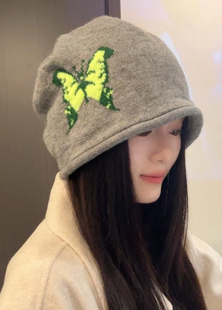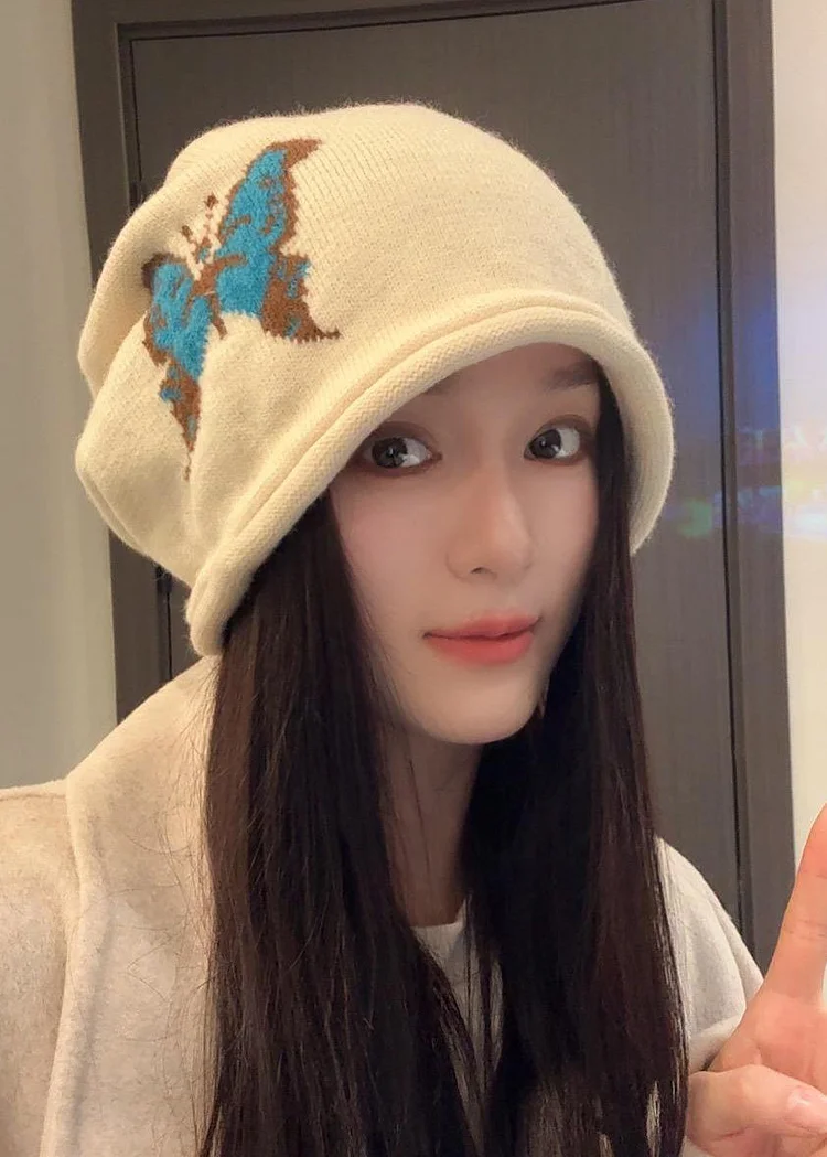 Fashion Beige Butterfly Embroidery Knit Bonnie Hat