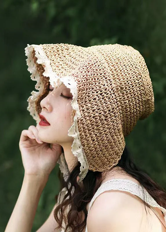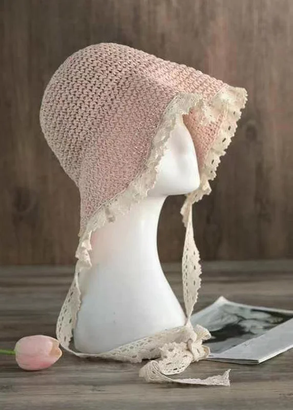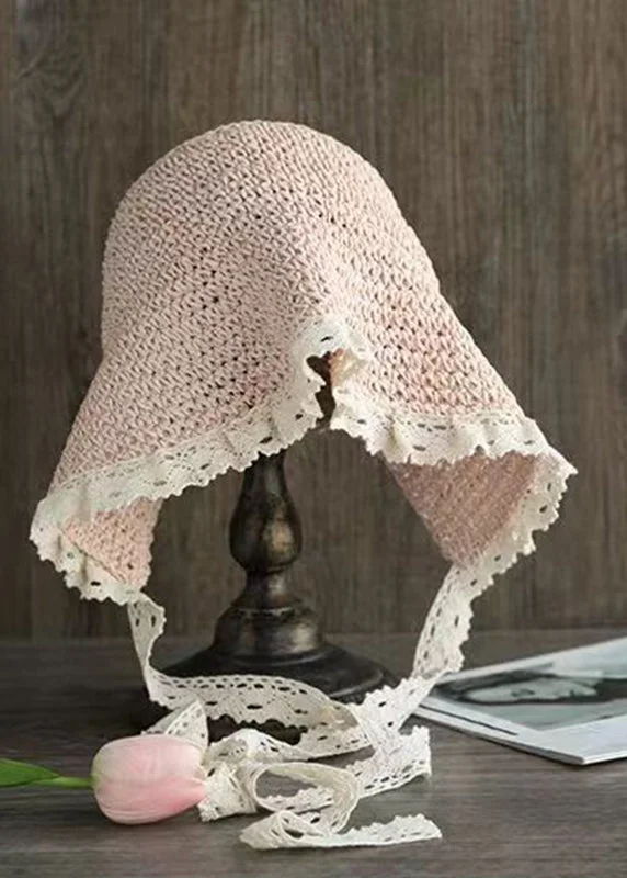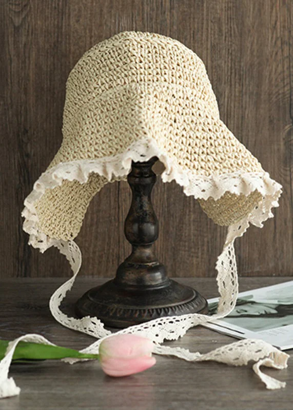 Women Beige Lace Patchwork Knit Blended Hollow Out Bucket Hat
